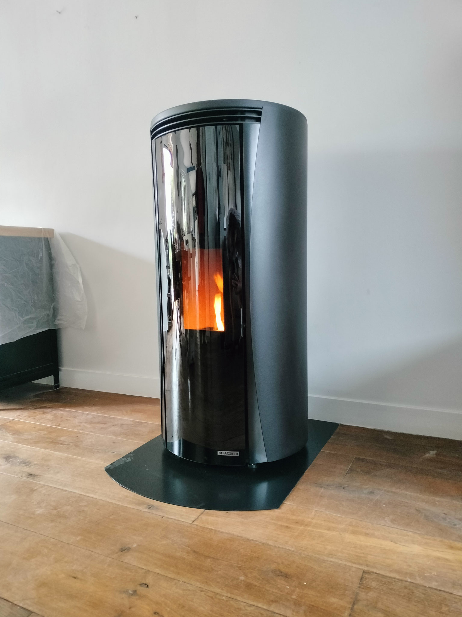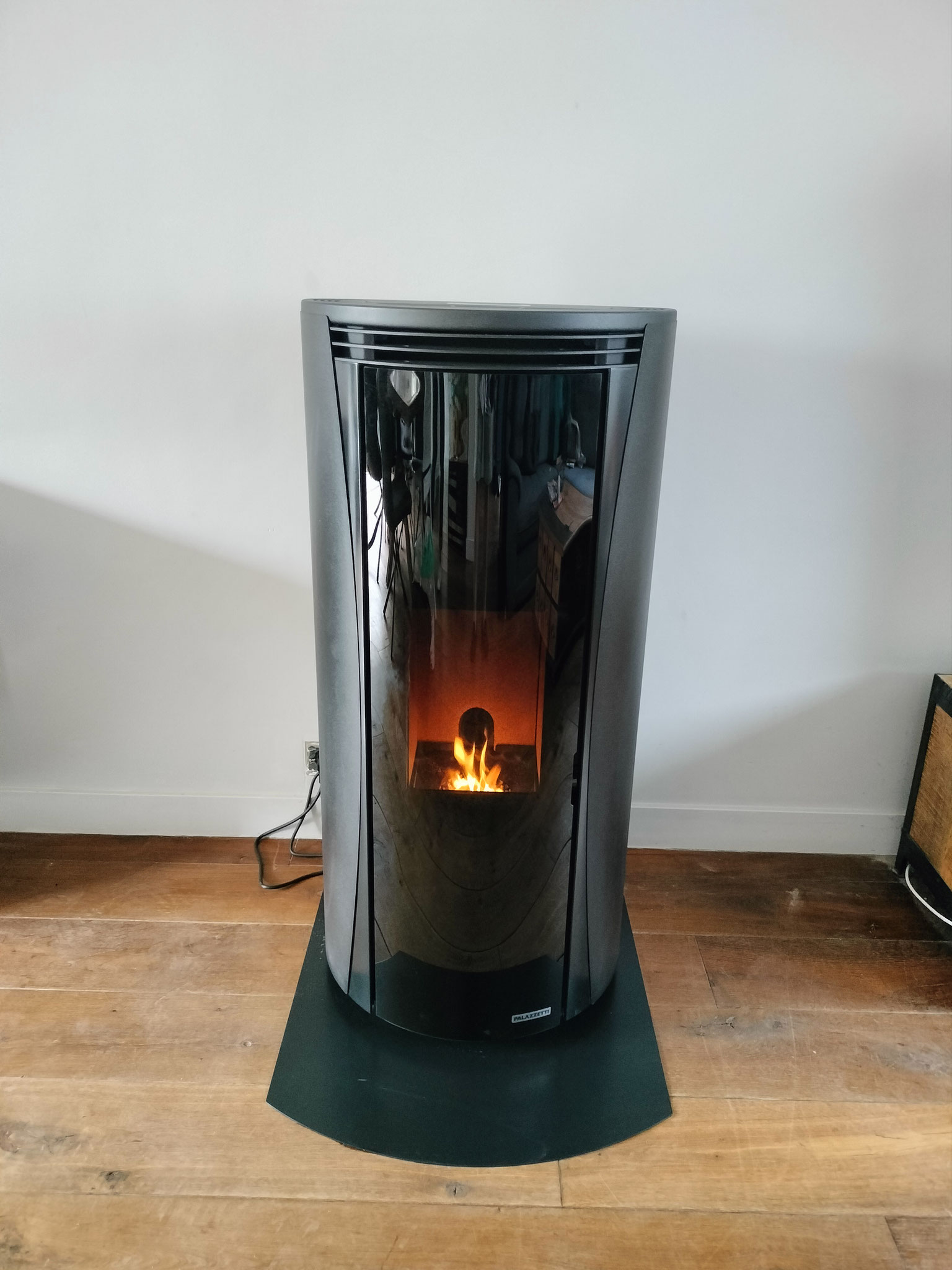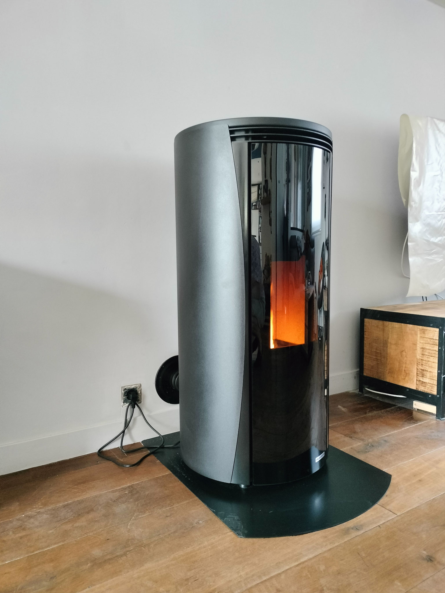 Le poêle à granulés de la marque Moretti modèle Globe Glass Relax installé en métropole lilloise. Le choix de notre cliente très sensible aux bruits s'est orienté vers ce modèle pour son fonctionnement ultra silencieux .